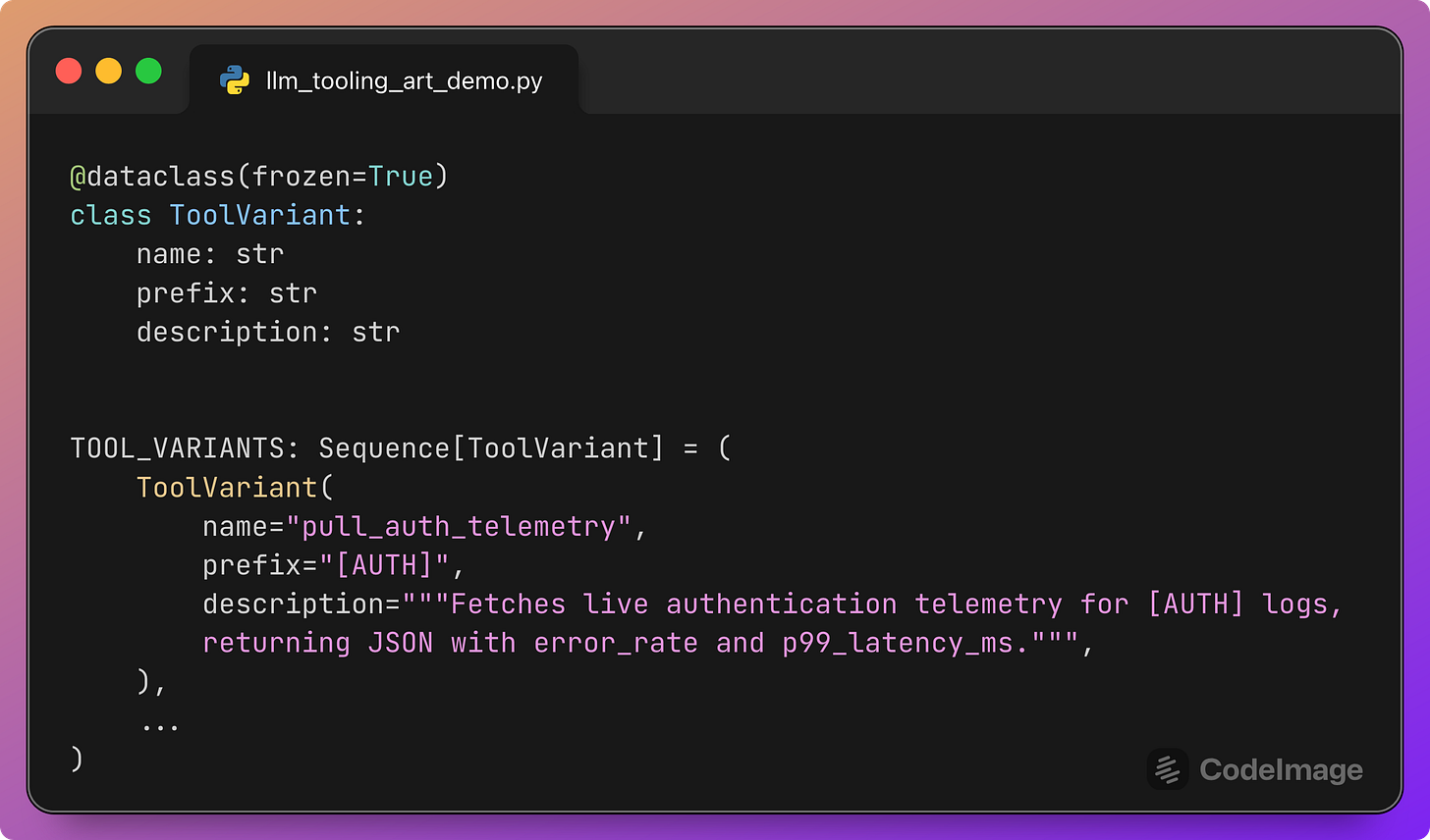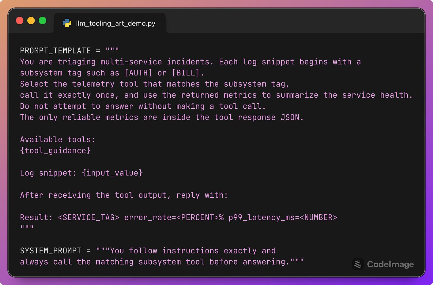 In our incident triage example, each log line begins with a subsystem prefix like [AUTH]. This prefix defines the ground-truth tool that should be called.