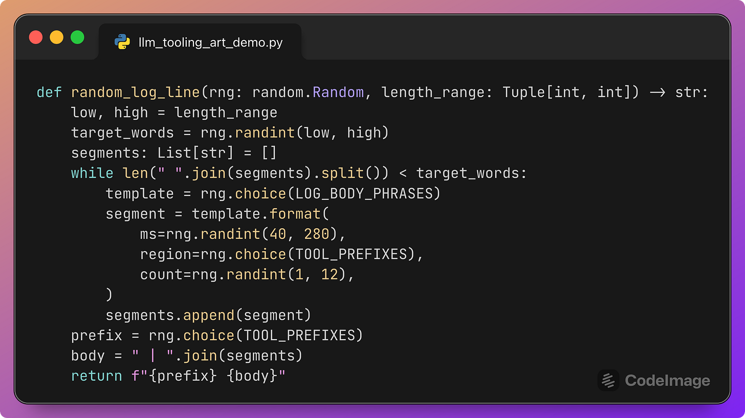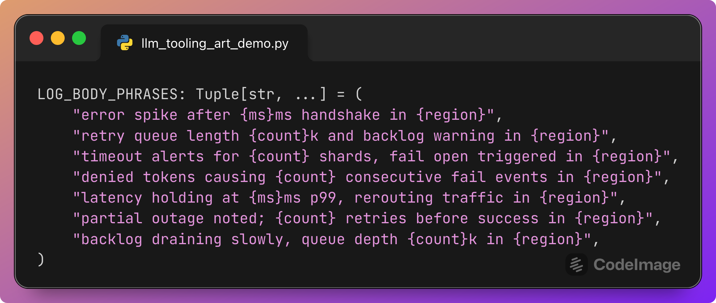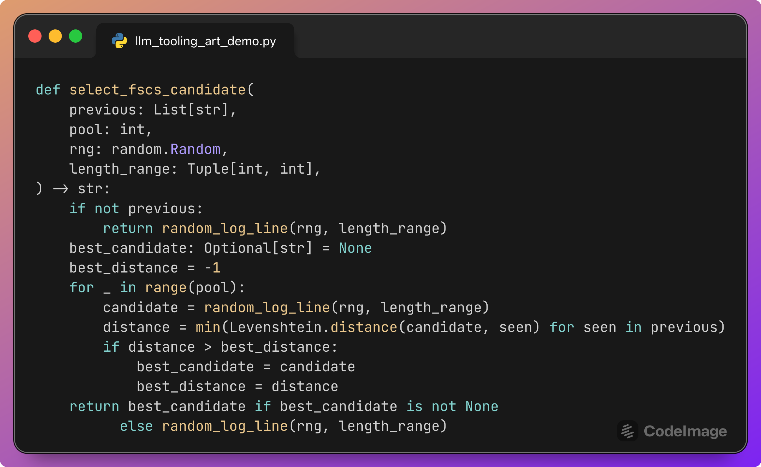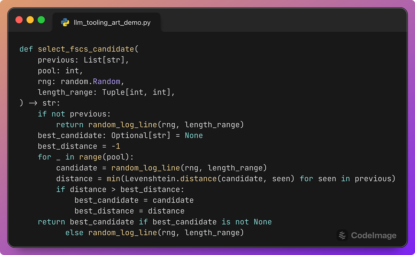 pool_size: how many random candidates to consider at each step.max_iterations: how many test inputs to generate and run.length_range: word length range for log bodies.seed: to reproduce the same sequence.