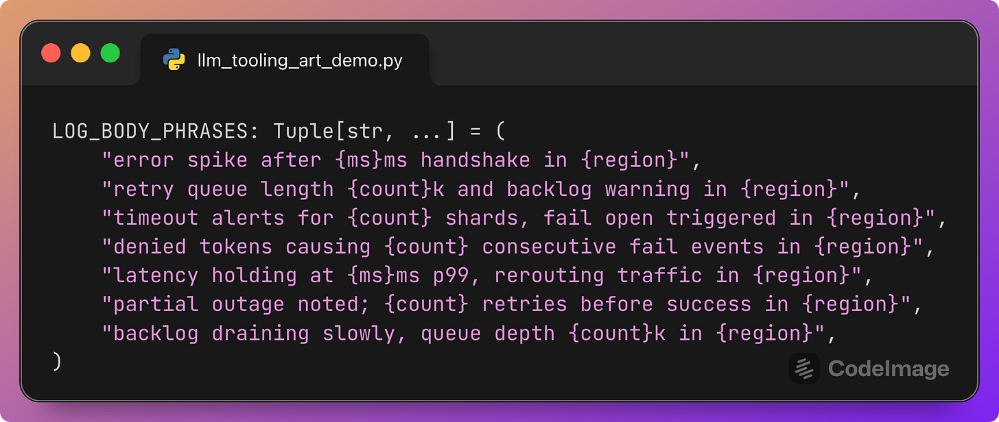 Each phrase describes a segment of the log body with placeholders for numbers and a region. Notice that {region} is later filled using TOOL_PREFIXES, which are the same tags used for subsystems. Note that this may cause the model to fail in calling the correct tool; the model should find the correct tool from the beginning of the log line, not from the end.