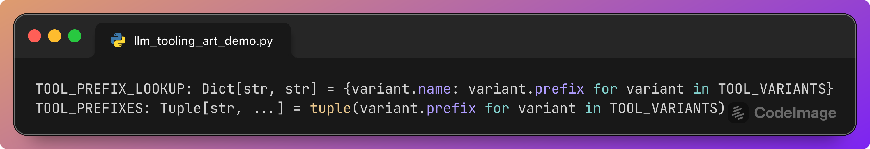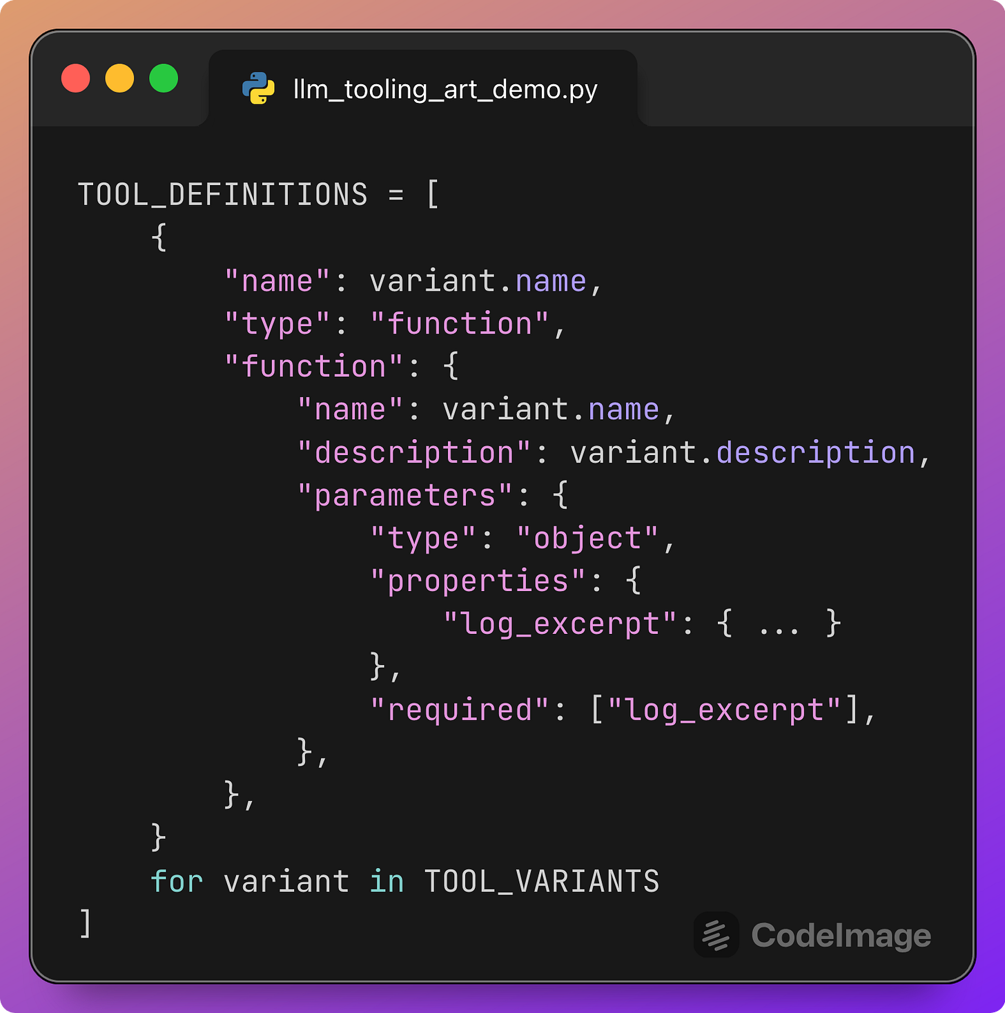 The TOOL_DEFINITIONS list then converts these variants into the JSON schema expected by the responses API: