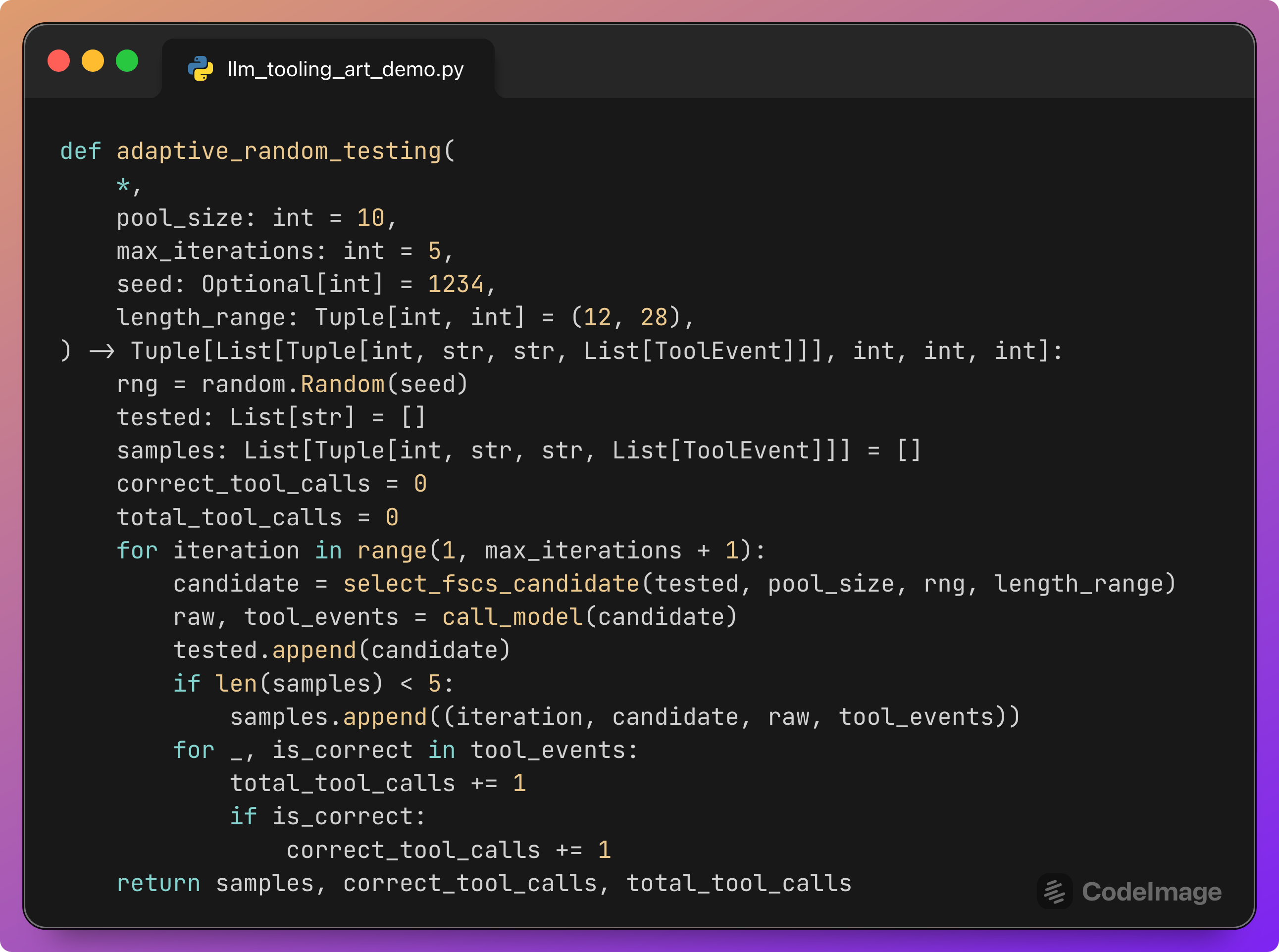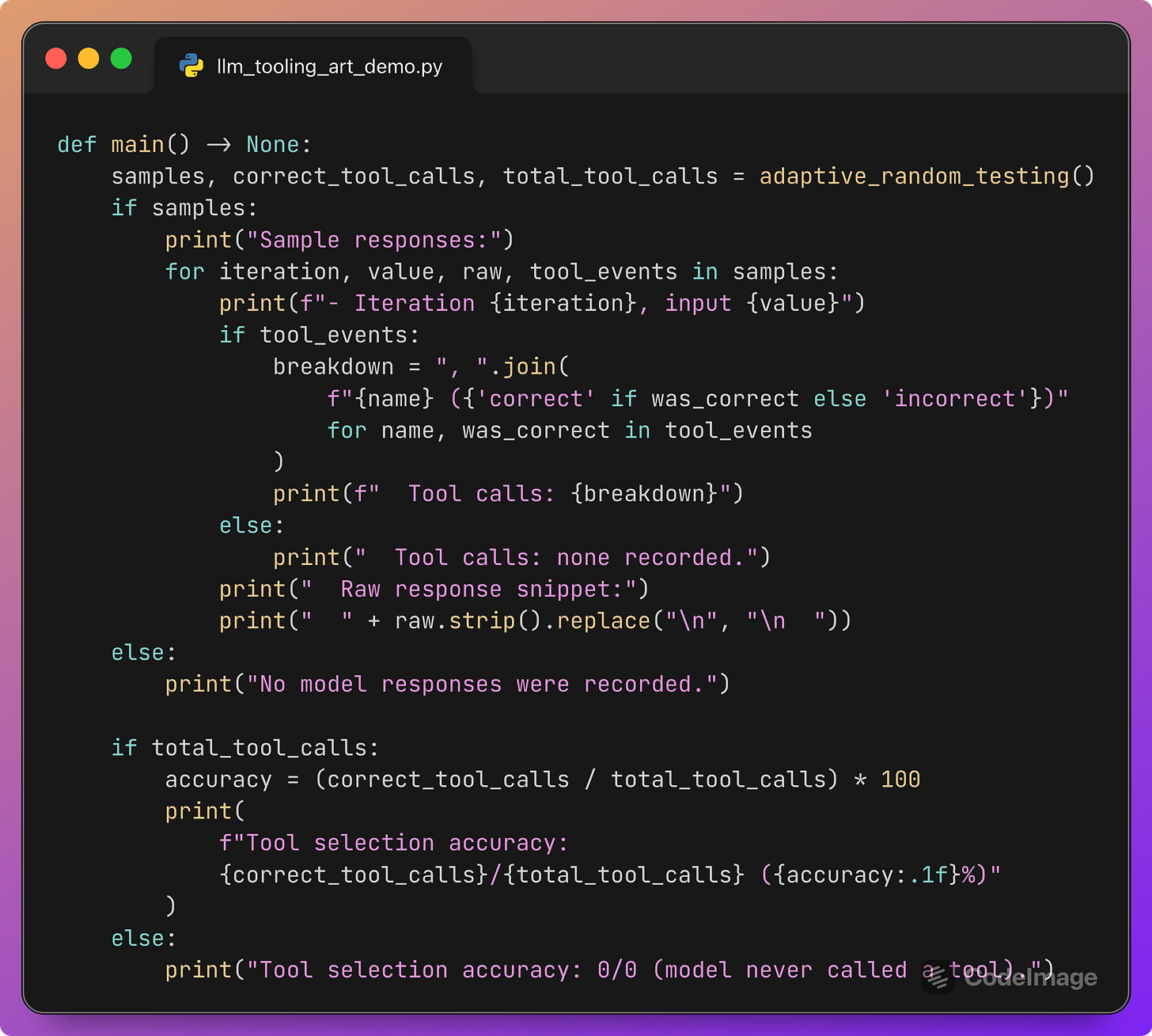 Adaptive Random Testing gives you a practical method to explore the input space more systematically. Tool Call Accuracy gives you a precise, focused signal of whether the model respects your tool-level contract across that space.