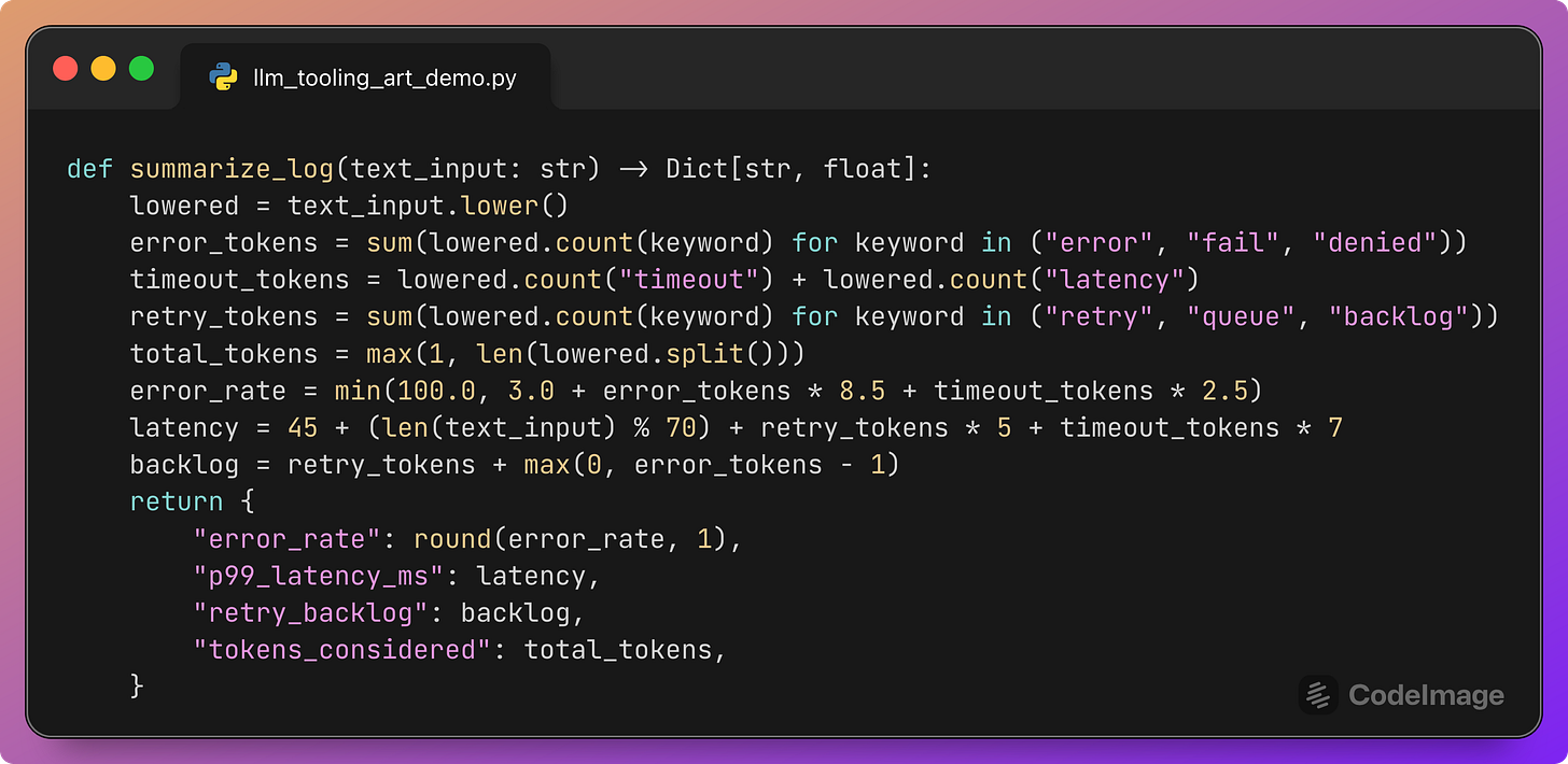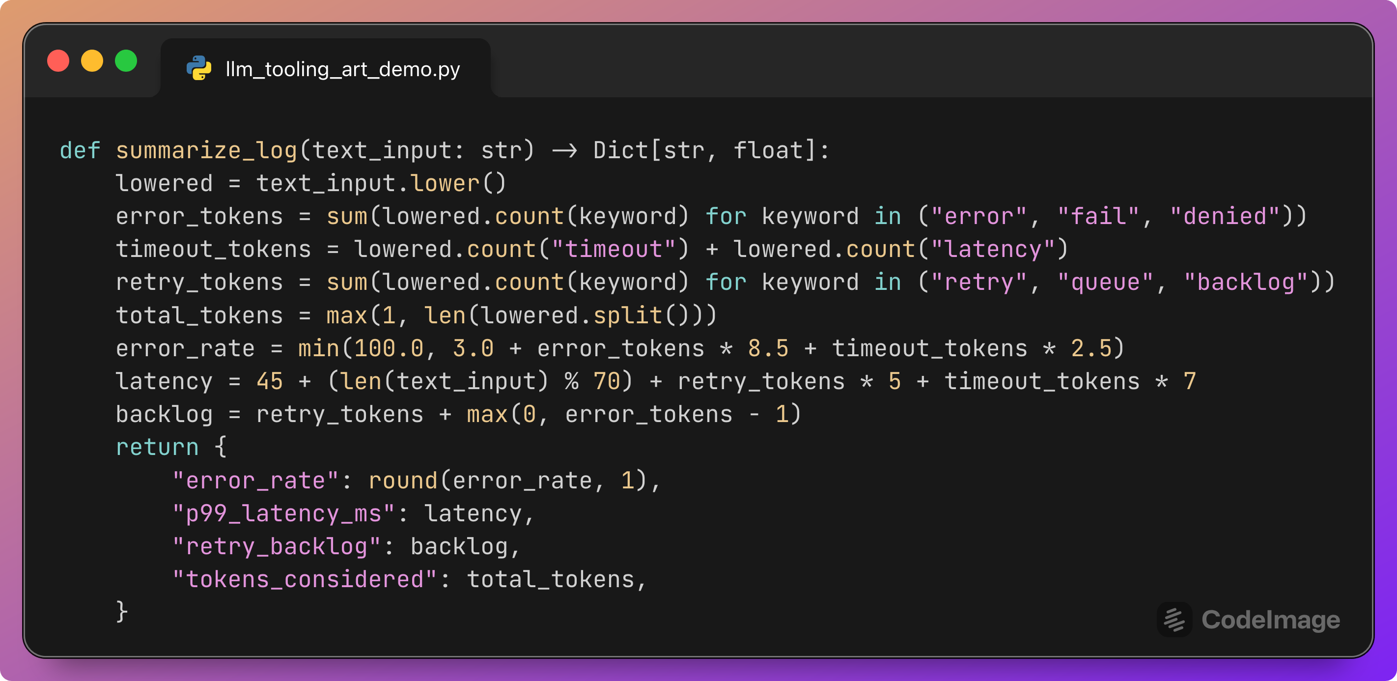 error_rate,p99_latency_ms, and aretry_backlog.Returns a small JSON-like dictionary that mimics a real telemetry response.