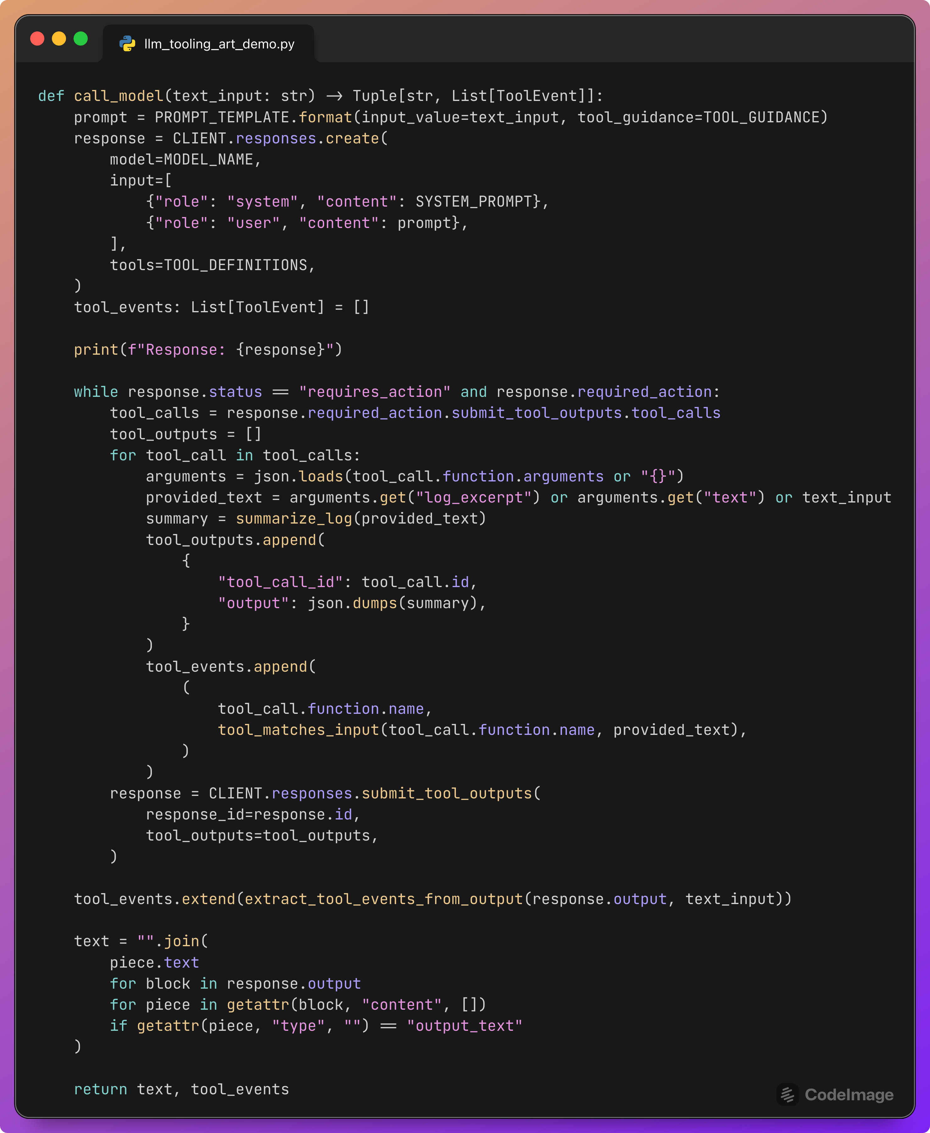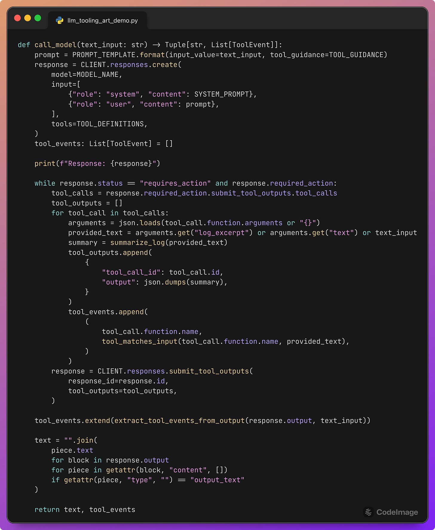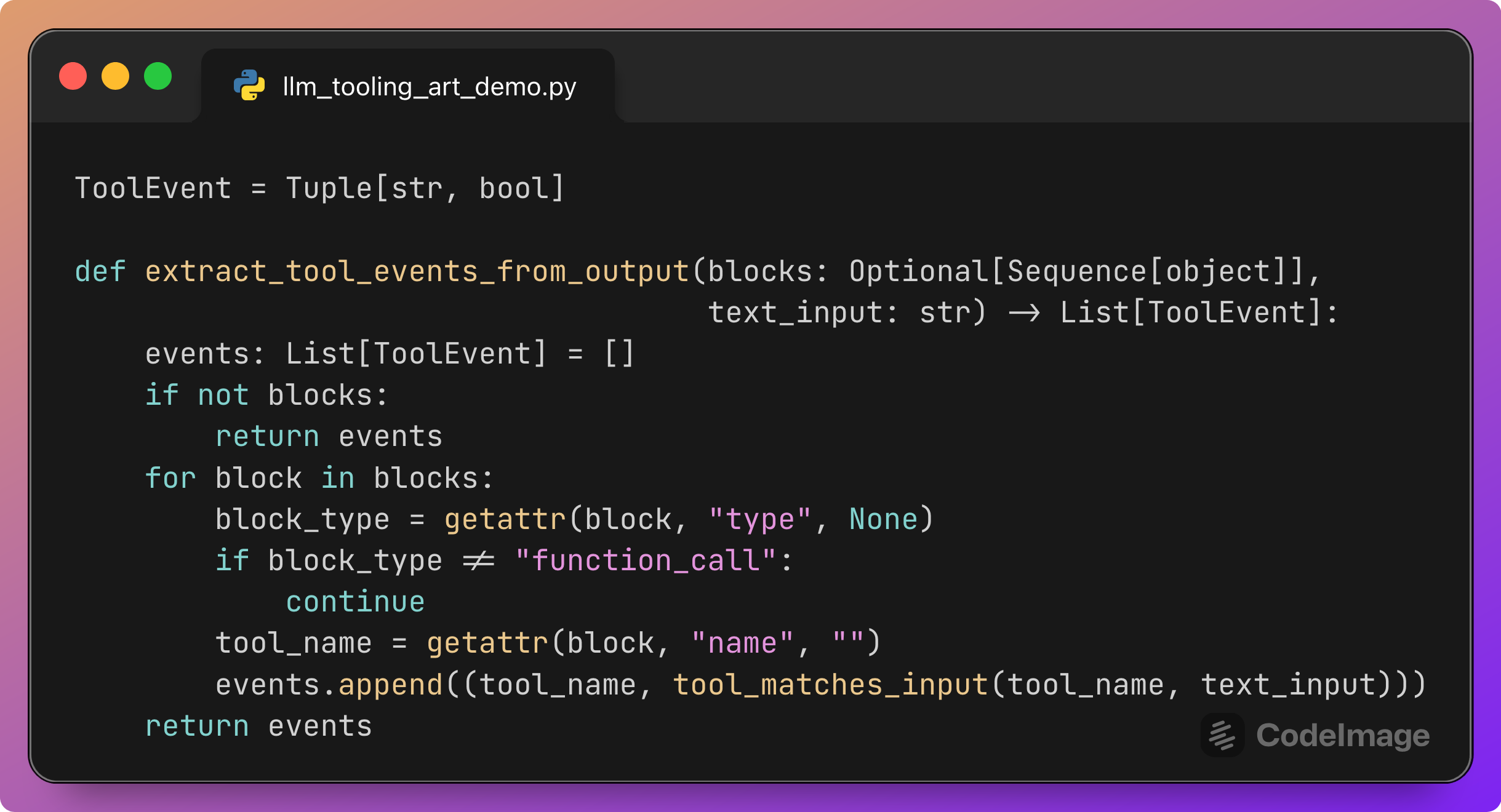 The responses API may also describe tool calls inside the final response.output. This helper scans these blocks and records each tool call as a ToolEvent: