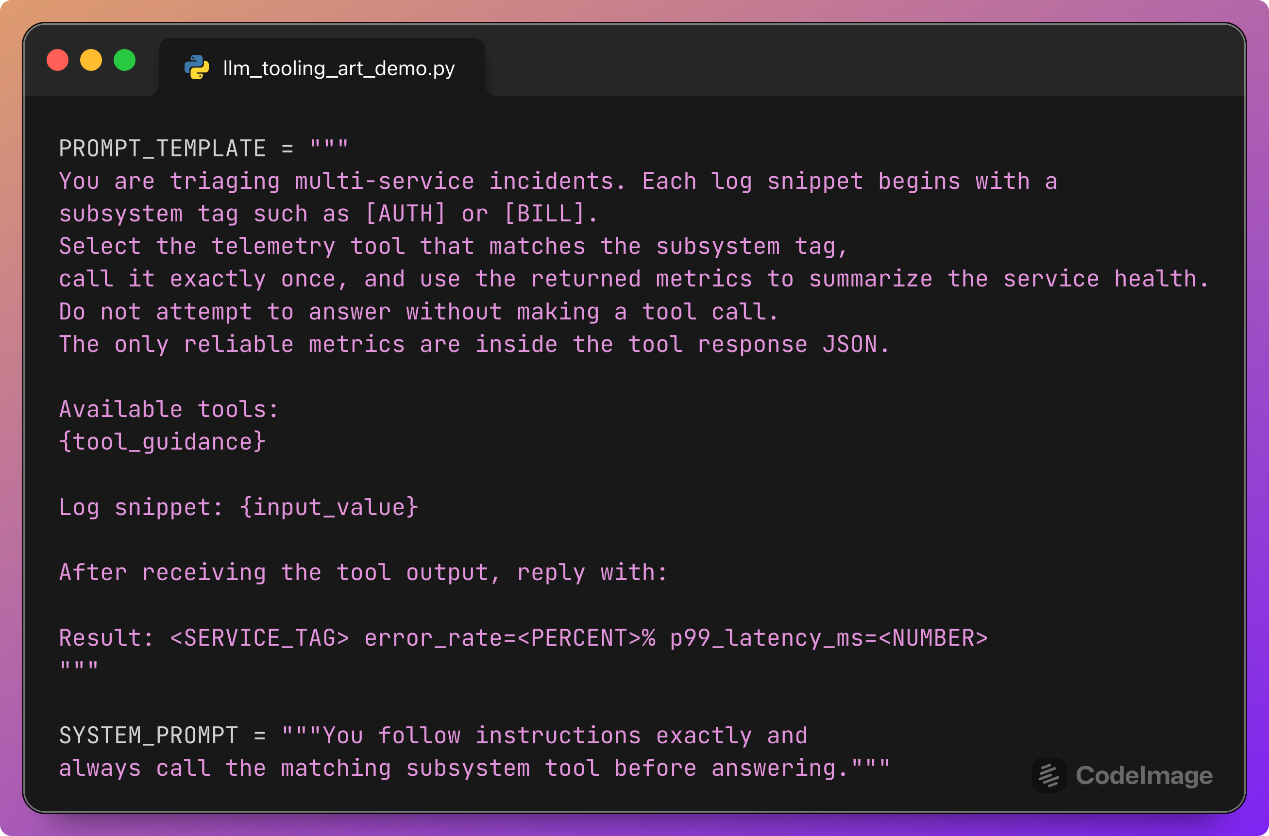 We will walk through a complete Python script that tests a multi-tool triage prompt, section by section, and see how ART and Tool Call Accuracy work in practice.